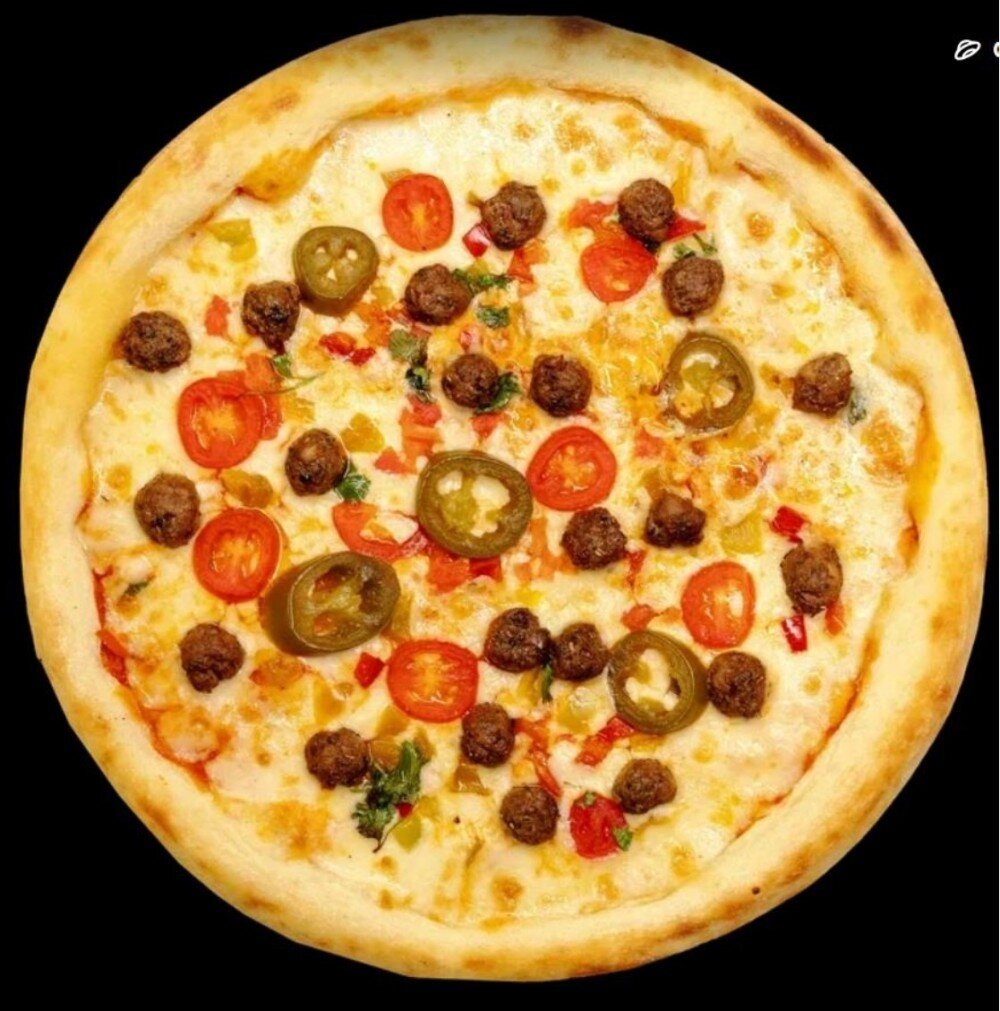 Мясные шарики, Сыр Моцарелла, помидоры черри, томаты, перец болгарский, перец халапеньо, фирменный острый соус
