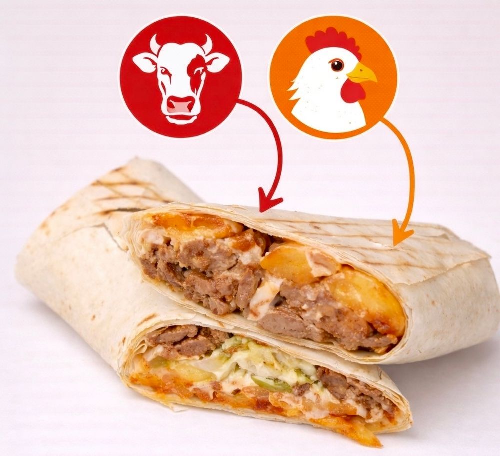 Лаваш, курица, говядина, томаты, огурцы, фри, чесночный соус, фирменный томатный соус , добавка перец халапеньо