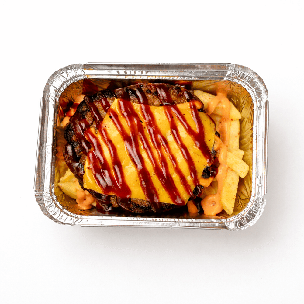 Фри, фирменная котлета, сыр Пармезан, чесчночный соус, огурцы, перец Халапеньо